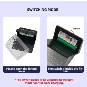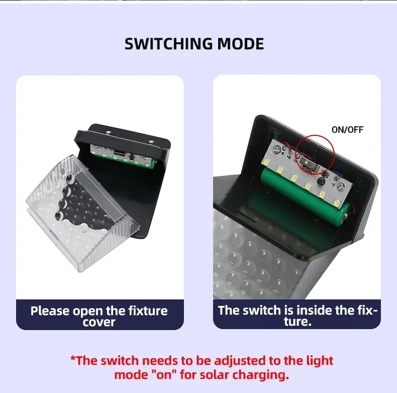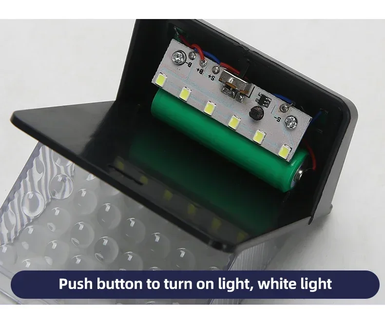 4. 3 Lighting Modes: (1). Induction mode (the light goes out 20-25s after the person comes and highlights) (2). Induction + slightly bright mode (people come to highlight, people go slightly bright, slightly bright 10% brightness) (3). No induction mode, 50% light 5. Battery life: charge for 6-8 hours in the daytime, 50 times per night