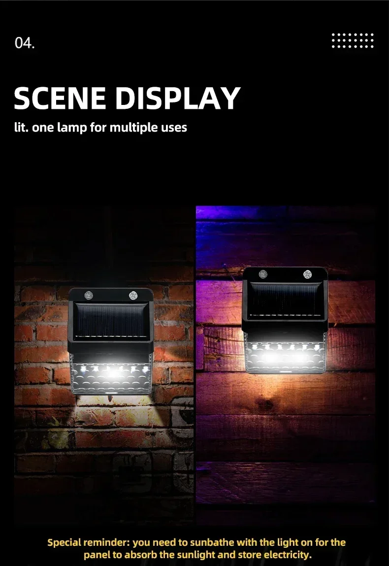 1. Wide application: IP65 outdoor solar lamp, suitable for garden, swimming pool, fence, courtyard, driveway, stairs, external wall, etc., heat resistant, weatherproof, no need to worry about outdoor damage