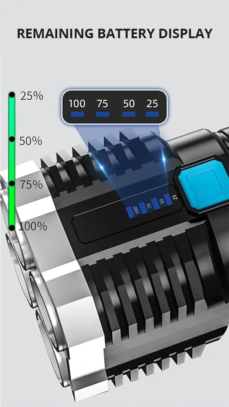 ✔️ battery indicator – saves lots of extra batteries. Our flashlight has a built-in high-capacity lithium battery that can be charged via the included USB cable and recharged. Its indicator light showing the battery level reminds you to recharge the flashlight if it runs out of power. When charging, this indicator light shows the remaining power that needs to be charged.